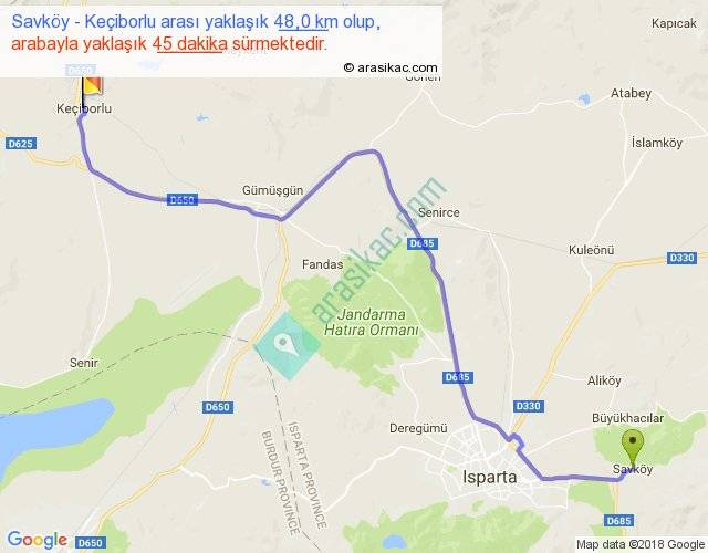 Savköy - Keçiborlu arası yaklaşık olarak 90 km/h ile yukarıda belirtilen sürede olup, iki yerin kuş uçuşu uzaklığı (mesafesi) 36'dir. Yolculuk otobüsle 58 dakika sürmektedir.