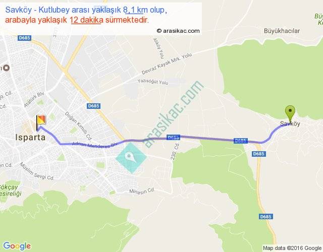 Savköy - Kutlubey arası yaklaşık olarak 90 km/h ile yukarıda belirtilen sürede olup, iki yerin kuş uçuşu uzaklığı (mesafesi) 8'dir. Yolculuk otobüsle 15 dakika sürmektedir.