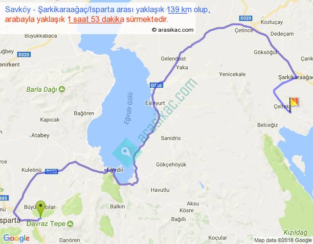 Savköy - Şarkikaraağaç Isparta arası yaklaşık olarak 90 km/h ile yukarıda belirtilen sürede olup, iki yerin kuş uçuşu uzaklığı (mesafesi) 67'dir. Yolculuk otobüsle 2 saat 26 dakika sürmektedir.