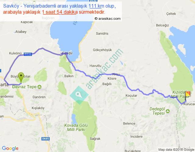 Savköy - Yenişarbademli arası yaklaşık olarak 90 km/h ile yukarıda belirtilen sürede olup, iki yerin kuş uçuşu uzaklığı (mesafesi) 65'dir. Yolculuk otobüsle 2 saat 28 dakika sürmektedir.