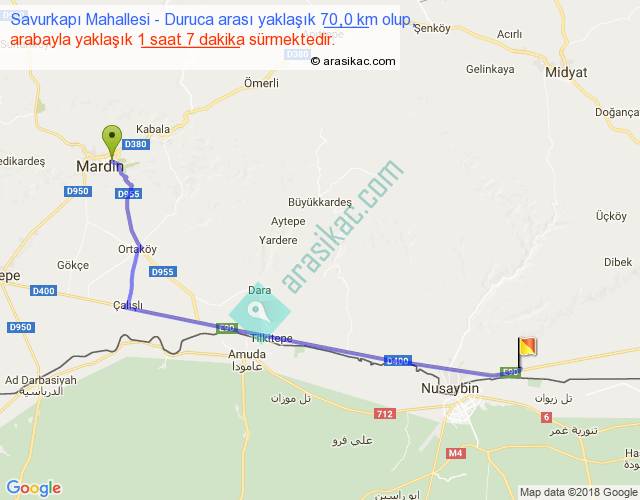 Savurkapı Mahallesi - Duruca arası yaklaşık olarak 90 km/h ile yukarıda belirtilen sürede olup, iki yerin kuş uçuşu uzaklığı (mesafesi) 55'dir. Yolculuk otobüsle 1 saat 27 dakika sürmektedir.
