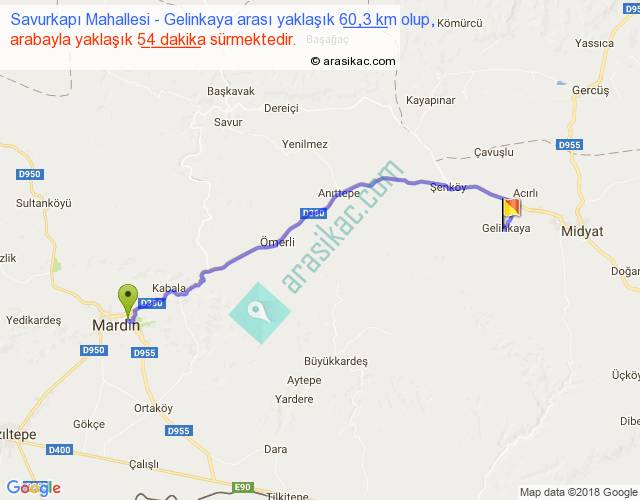 Savurkapı Mahallesi - Gelinkaya arası yaklaşık olarak 90 km/h ile yukarıda belirtilen sürede olup, iki yerin kuş uçuşu uzaklığı (mesafesi) 47'dir. Yolculuk otobüsle 1 saat 10 dakika sürmektedir.