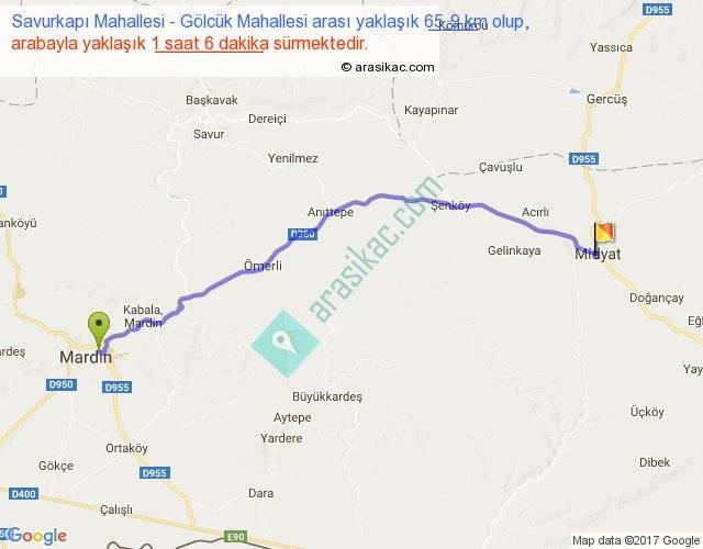 Savurkapı Mahallesi - Gölcük Mahallesi arası yaklaşık olarak 90 km/h ile yukarıda belirtilen sürede olup, iki yerin kuş uçuşu uzaklığı (mesafesi) 56'dir. Yolculuk otobüsle 1 saat 25 dakika sürmektedir.