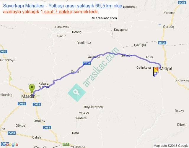 Savurkapı Mahallesi - Yolbaşı arası yaklaşık olarak 90 km/h ile yukarıda belirtilen sürede olup, iki yerin kuş uçuşu uzaklığı (mesafesi) 50'dir. Yolculuk otobüsle 1 saat 27 dakika sürmektedir.
