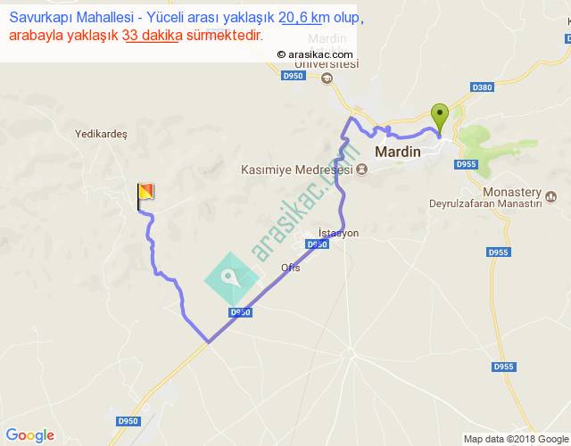 Savurkapı Mahallesi - Yüceli arası yaklaşık olarak 90 km/h ile yukarıda belirtilen sürede olup, iki yerin kuş uçuşu uzaklığı (mesafesi) 10'dir. Yolculuk otobüsle 42 dakika sürmektedir.