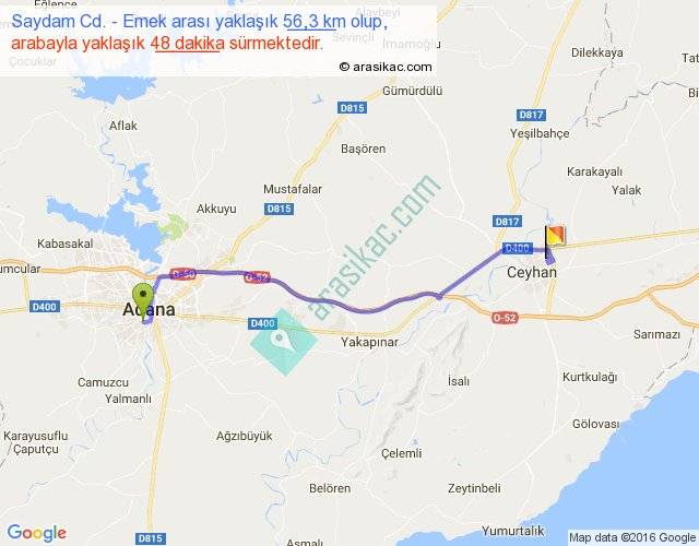 Saydam Cd. - Emek arası yaklaşık olarak 90 km/h ile yukarıda belirtilen sürede olup, iki yerin kuş uçuşu uzaklığı (mesafesi) 45'dir. Yolculuk otobüsle 1 saat 2 dakika sürmektedir.