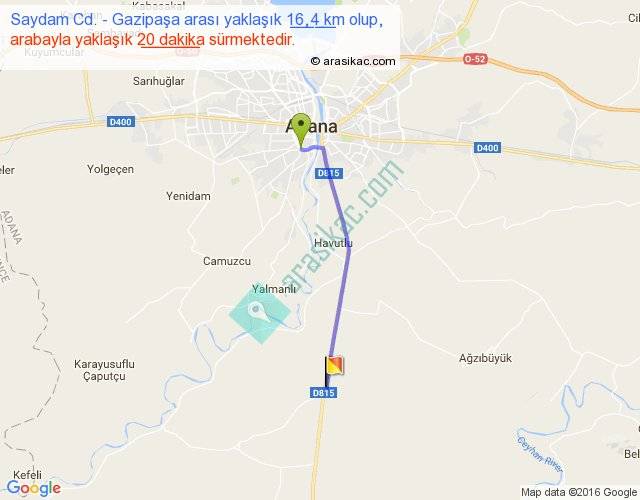 Saydam Cd. - Gazipaşa arası yaklaşık olarak 90 km/h ile yukarıda belirtilen sürede olup, iki yerin kuş uçuşu uzaklığı (mesafesi) 15'dir. Yolculuk otobüsle 26 dakika sürmektedir.