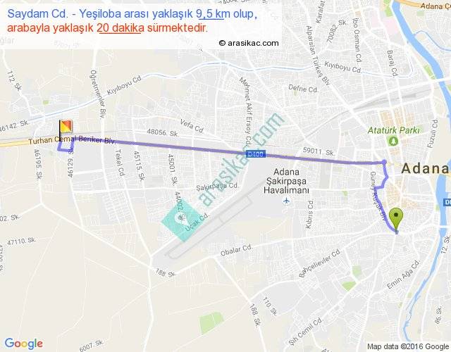 Saydam Cd. - Yeşiloba arası yaklaşık olarak 90 km/h ile yukarıda belirtilen sürede olup, iki yerin kuş uçuşu uzaklığı (mesafesi) 7'dir. Yolculuk otobüsle 26 dakika sürmektedir.