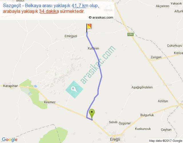Sazgeçit - Belkaya arası yaklaşık olarak 90 km/h ile yukarıda belirtilen sürede olup, iki yerin kuş uçuşu uzaklığı (mesafesi) 37'dir. Yolculuk otobüsle 44 dakika sürmektedir.