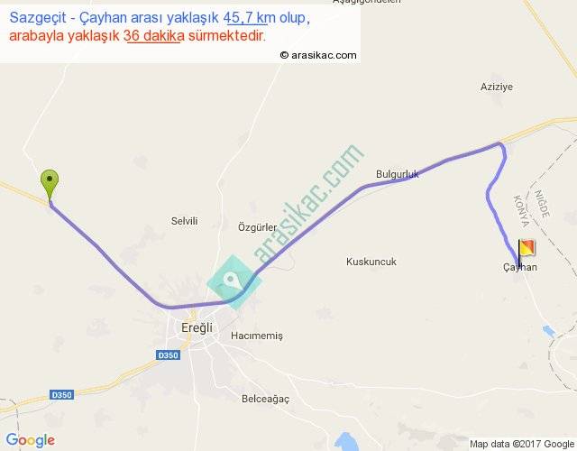 Sazgeçit - Çayhan arası yaklaşık olarak 90 km/h ile yukarıda belirtilen sürede olup, iki yerin kuş uçuşu uzaklığı (mesafesi) 32'dir. Yolculuk otobüsle 46 dakika sürmektedir.
