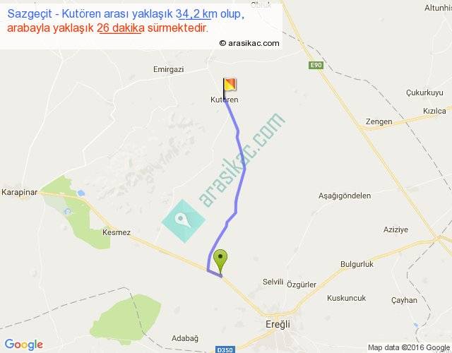 Sazgeçit - Kutören arası yaklaşık olarak 90 km/h ile yukarıda belirtilen sürede olup, iki yerin kuş uçuşu uzaklığı (mesafesi) 30'dir. Yolculuk otobüsle 33 dakika sürmektedir.