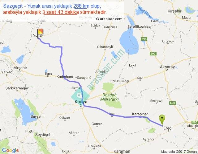 Sazgeçit - Yunak arası yaklaşık olarak 90 km/h ile yukarıda belirtilen sürede olup, iki yerin kuş uçuşu uzaklığı (mesafesi) 234'dir. Yolculuk otobüsle 4 saat 49 dakika sürmektedir.
