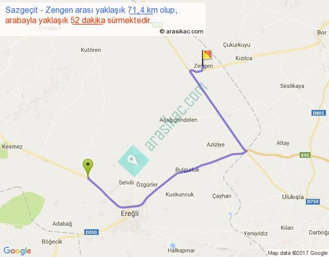 Sazgeçit - Zengen arası yaklaşık olarak 90 km/h ile yukarıda belirtilen sürede olup, iki yerin kuş uçuşu uzaklığı (mesafesi) 37'dir. Yolculuk otobüsle 1 saat 7 dakika sürmektedir.