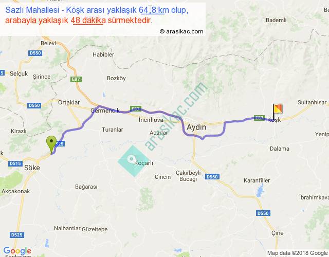 Sazlı Mahallesi - Köşk arası yaklaşık olarak 90 km/h ile yukarıda belirtilen sürede olup, iki yerin kuş uçuşu uzaklığı (mesafesi) 53'dir. Yolculuk otobüsle 1 saat 2 dakika sürmektedir.