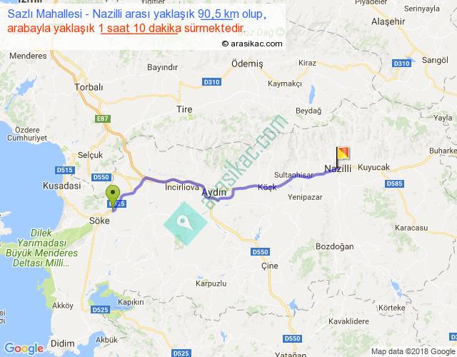 Sazlı Mahallesi - Nazilli arası yaklaşık olarak 90 km/h ile yukarıda belirtilen sürede olup, iki yerin kuş uçuşu uzaklığı (mesafesi) 77'dir. Yolculuk otobüsle 1 saat 31 dakika sürmektedir.