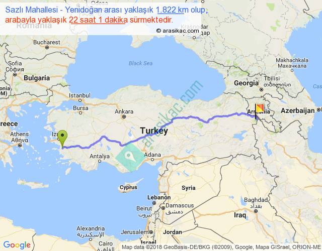 Sazlı Mahallesi - Yenidoğan arası yaklaşık olarak 90 km/h ile yukarıda belirtilen sürede olup, iki yerin kuş uçuşu uzaklığı (mesafesi) 1473'dir. Eğer belirtilen yerler arasında uçak seferi var ise bu süre uçakla 2 saat 15 dakika'ya kadar düşebilir. Yolculuk otobüsle 1 gün 4 saat sürmektedir.