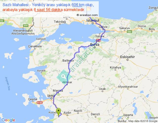 Sazlı Mahallesi - Yeniköy arası yaklaşık olarak 90 km/h ile yukarıda belirtilen sürede olup, iki yerin kuş uçuşu uzaklığı (mesafesi) 406'dir. Eğer belirtilen yerler arasında uçak seferi var ise bu süre uçakla 37 dakika'ya kadar düşebilir. Yolculuk otobüsle 9 saat 0 dakika sürmektedir.