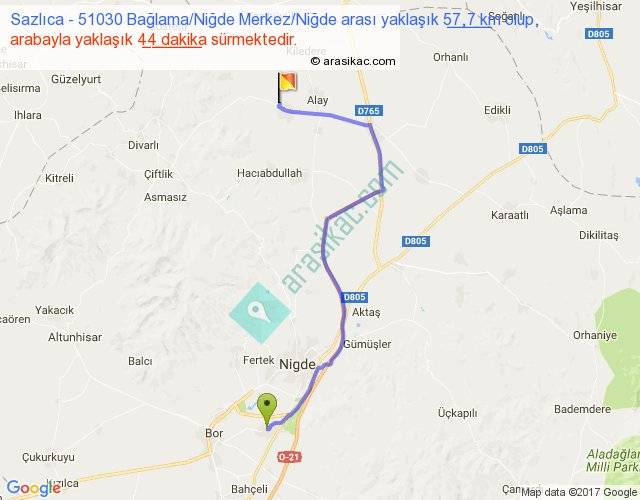 Sazlıca - 51030 Bağlama Niğde Merkez Niğde arası yaklaşık olarak 90 km/h ile yukarıda belirtilen sürede olup, iki yerin kuş uçuşu uzaklığı (mesafesi) 39'dir. Yolculuk otobüsle 57 dakika sürmektedir.
