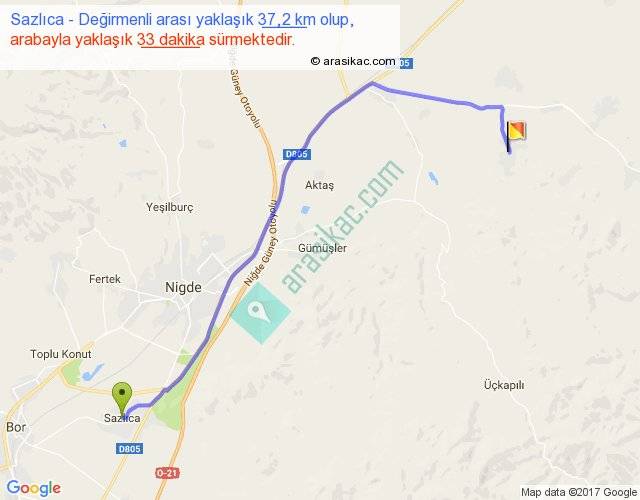 Sazlıca - Değirmenli arası yaklaşık olarak 90 km/h ile yukarıda belirtilen sürede olup, iki yerin kuş uçuşu uzaklığı (mesafesi) 28'dir. Yolculuk otobüsle 42 dakika sürmektedir.