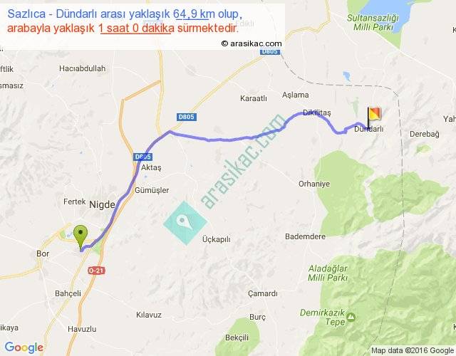 Sazlıca - Dündarlı arası yaklaşık olarak 90 km/h ile yukarıda belirtilen sürede olup, iki yerin kuş uçuşu uzaklığı (mesafesi) 53'dir. Yolculuk otobüsle 1 saat 18 dakika sürmektedir.
