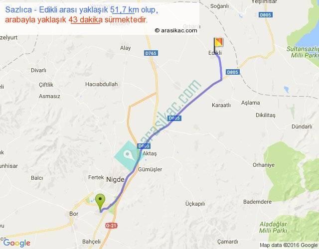 Sazlıca - Edikli arası yaklaşık olarak 90 km/h ile yukarıda belirtilen sürede olup, iki yerin kuş uçuşu uzaklığı (mesafesi) 47'dir. Yolculuk otobüsle 55 dakika sürmektedir.