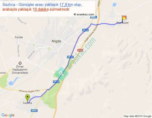 Sazlıca - Gümüşler arası yaklaşık olarak 90 km/h ile yukarıda belirtilen sürede olup, iki yerin kuş uçuşu uzaklığı (mesafesi) 16'dir. Yolculuk otobüsle 24 dakika sürmektedir.