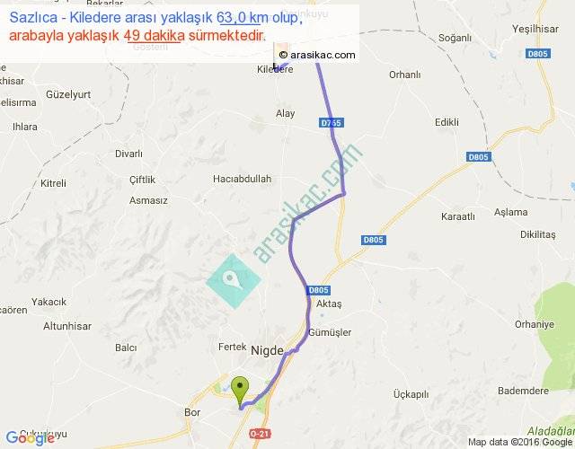 Sazlıca - Kiledere arası yaklaşık olarak 90 km/h ile yukarıda belirtilen sürede olup, iki yerin kuş uçuşu uzaklığı (mesafesi) 45'dir. Yolculuk otobüsle 1 saat 3 dakika sürmektedir.