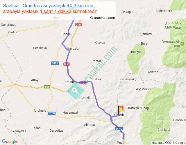 Sazlıca - Ömerli arası yaklaşık olarak 90 km/h ile yukarıda belirtilen sürede olup, iki yerin kuş uçuşu uzaklığı (mesafesi) 45'dir. Yolculuk otobüsle 1 saat 23 dakika sürmektedir.