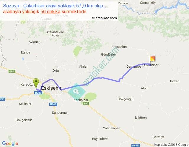 Sazova - Çukurhisar arası yaklaşık olarak 90 km/h ile yukarıda belirtilen sürede olup, iki yerin kuş uçuşu uzaklığı (mesafesi) 46'dir. Yolculuk otobüsle 1 saat 12 dakika sürmektedir.
