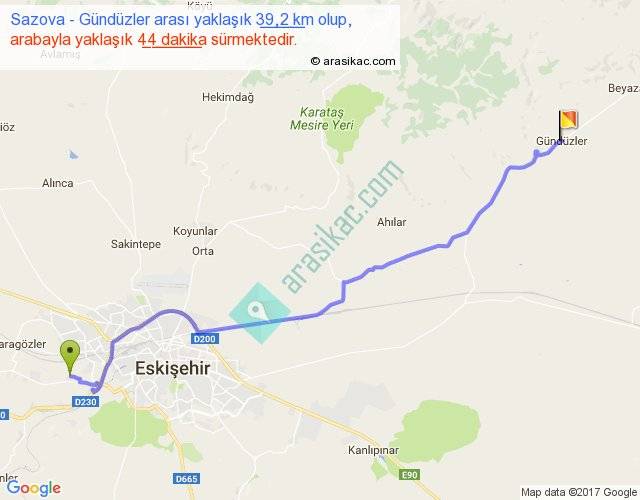 Sazova - Gündüzler arası yaklaşık olarak 90 km/h ile yukarıda belirtilen sürede olup, iki yerin kuş uçuşu uzaklığı (mesafesi) 32'dir. Yolculuk otobüsle 57 dakika sürmektedir.
