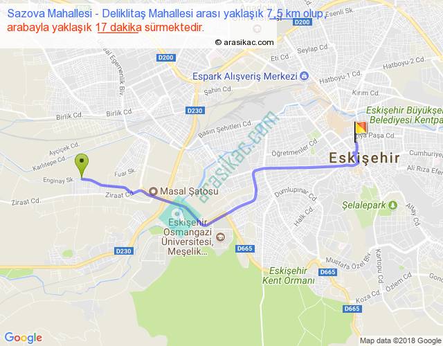 Sazova Mahallesi - Deliklitaş Mahallesi arası yaklaşık olarak 90 km/h ile yukarıda belirtilen sürede olup, iki yerin kuş uçuşu uzaklığı (mesafesi) 6'dir. Yolculuk otobüsle 22 dakika sürmektedir.