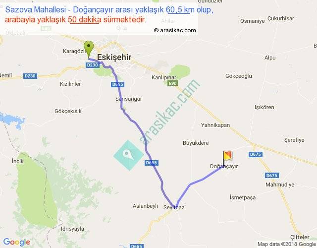 Sazova Mahallesi - Doğançayır arası yaklaşık olarak 90 km/h ile yukarıda belirtilen sürede olup, iki yerin kuş uçuşu uzaklığı (mesafesi) 41'dir. Yolculuk otobüsle 1 saat 5 dakika sürmektedir.