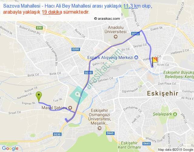 Sazova Mahallesi - Hacı Ali Bey Mahallesi arası yaklaşık olarak 90 km/h ile yukarıda belirtilen sürede olup, iki yerin kuş uçuşu uzaklığı (mesafesi) 6'dir. Yolculuk otobüsle 24 dakika sürmektedir.