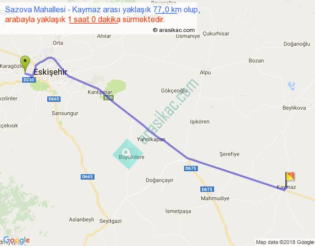 Sazova Mahallesi - Kaymaz arası yaklaşık olarak 90 km/h ile yukarıda belirtilen sürede olup, iki yerin kuş uçuşu uzaklığı (mesafesi) 68'dir. Yolculuk otobüsle 1 saat 18 dakika sürmektedir.