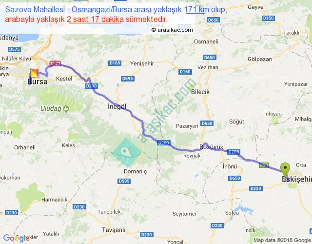 Sazova Mahallesi - Osmangazi Bursa arası yaklaşık olarak 90 km/h ile yukarıda belirtilen sürede olup, iki yerin kuş uçuşu uzaklığı (mesafesi) 130'dir. Yolculuk otobüsle 2 saat 58 dakika sürmektedir.