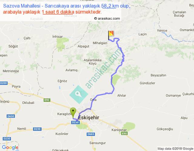 Sazova Mahallesi - Sarıcakaya arası yaklaşık olarak 90 km/h ile yukarıda belirtilen sürede olup, iki yerin kuş uçuşu uzaklığı (mesafesi) 33'dir. Yolculuk otobüsle 1 saat 25 dakika sürmektedir.