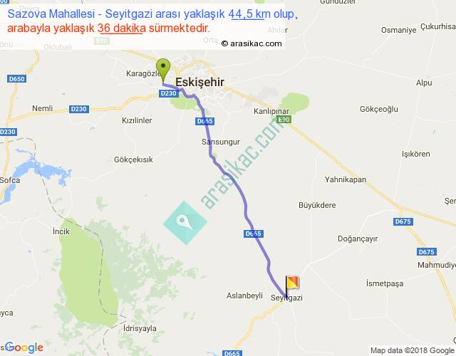 Sazova Mahallesi - Seyitgazi arası yaklaşık olarak 90 km/h ile yukarıda belirtilen sürede olup, iki yerin kuş uçuşu uzaklığı (mesafesi) 41'dir. Yolculuk otobüsle 46 dakika sürmektedir.