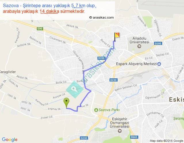 Sazova - Şirintepe arası yaklaşık olarak 90 km/h ile yukarıda belirtilen sürede olup, iki yerin kuş uçuşu uzaklığı (mesafesi) 4'dir. Yolculuk otobüsle 18 dakika sürmektedir.