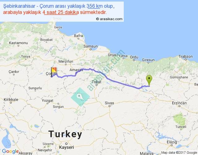 Şebinkarahisar - Çorum arası yaklaşık olarak 90 km/h ile yukarıda belirtilen sürede olup, iki yerin kuş uçuşu uzaklığı (mesafesi) 293'dir. Eğer belirtilen yerler arasında uçak seferi var ise bu süre uçakla 27 dakika'ya kadar düşebilir. Yolculuk otobüsle 5 saat 44 dakika sürmektedir.