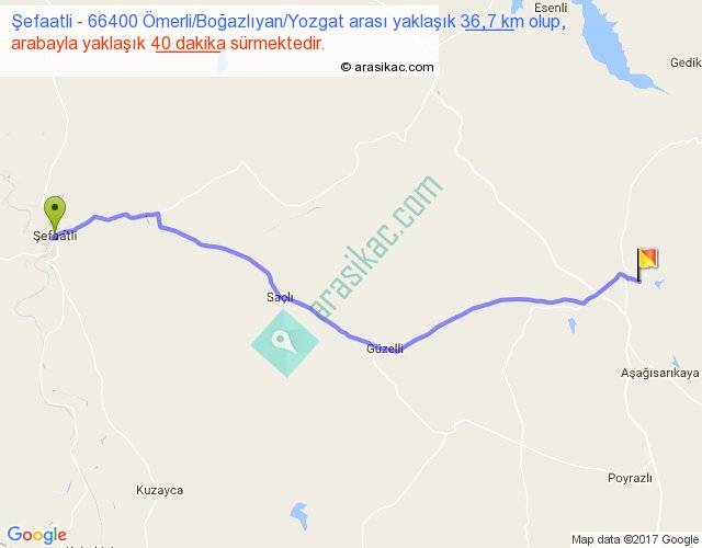 Şefaatli - 66400 Ömerli Boğazlıyan Yozgat arası yaklaşık olarak 90 km/h ile yukarıda belirtilen sürede olup, iki yerin kuş uçuşu uzaklığı (mesafesi) 31'dir. Yolculuk otobüsle 52 dakika sürmektedir.