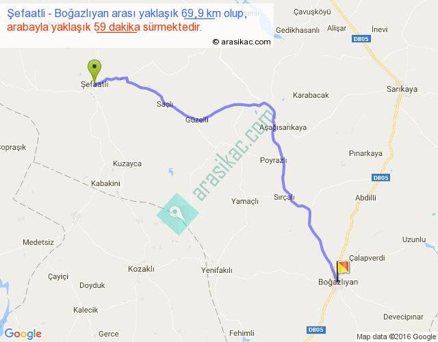 Şefaatli - Boğazlıyan arası yaklaşık olarak 90 km/h ile yukarıda belirtilen sürede olup, iki yerin kuş uçuşu uzaklığı (mesafesi) 54'dir. Yolculuk otobüsle 1 saat 16 dakika sürmektedir.