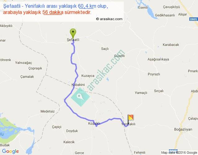 Şefaatli - Yenifakılı arası yaklaşık olarak 90 km/h ile yukarıda belirtilen sürede olup, iki yerin kuş uçuşu uzaklığı (mesafesi) 38'dir. Yolculuk otobüsle 1 saat 12 dakika sürmektedir.