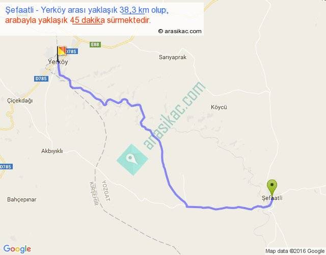 Şefaatli - Yerköy arası yaklaşık olarak 90 km/h ile yukarıda belirtilen sürede olup, iki yerin kuş uçuşu uzaklığı (mesafesi) 29'dir. Yolculuk otobüsle 58 dakika sürmektedir.