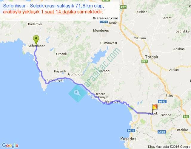 Seferihisar - Selçuk arası yaklaşık olarak 90 km/h ile yukarıda belirtilen sürede olup, iki yerin kuş uçuşu uzaklığı (mesafesi) 54'dir. Yolculuk otobüsle 1 saat 36 dakika sürmektedir.