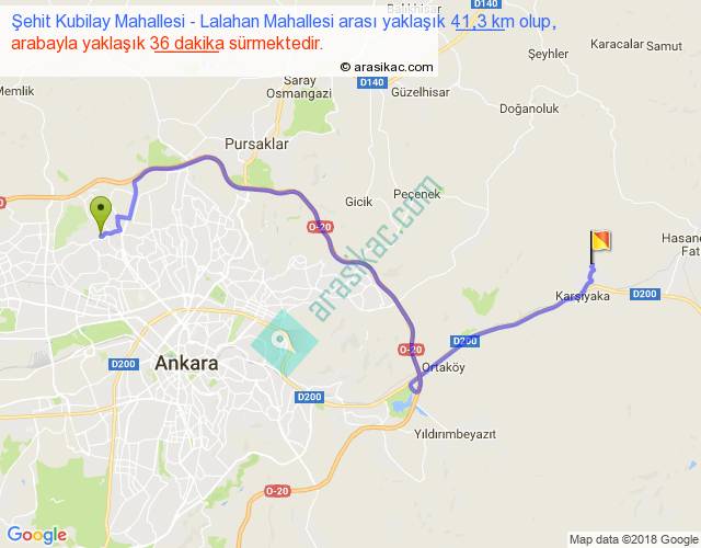 Şehit Kubilay Mahallesi - Lalahan Mahallesi arası yaklaşık olarak 90 km/h ile yukarıda belirtilen sürede olup, iki yerin kuş uçuşu uzaklığı (mesafesi) 26'dir. Yolculuk otobüsle 46 dakika sürmektedir.