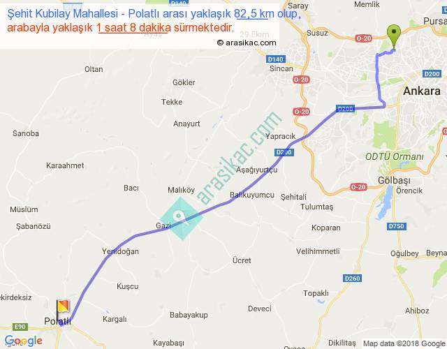 Şehit Kubilay Mahallesi - Polatlı arası yaklaşık olarak 90 km/h ile yukarıda belirtilen sürede olup, iki yerin kuş uçuşu uzaklığı (mesafesi) 72'dir. Yolculuk otobüsle 1 saat 28 dakika sürmektedir.