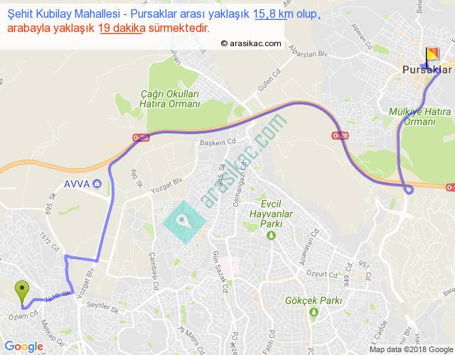 Şehit Kubilay Mahallesi - Pursaklar arası yaklaşık olarak 90 km/h ile yukarıda belirtilen sürede olup, iki yerin kuş uçuşu uzaklığı (mesafesi) 10'dir. Yolculuk otobüsle 24 dakika sürmektedir.