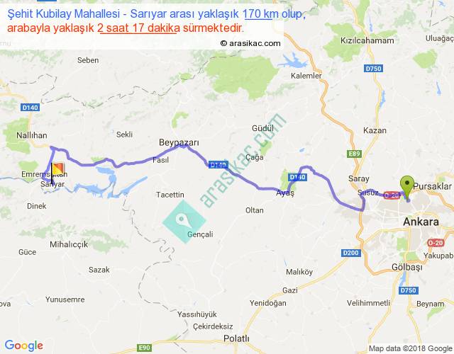 Şehit Kubilay Mahallesi - Sarıyar arası yaklaşık olarak 90 km/h ile yukarıda belirtilen sürede olup, iki yerin kuş uçuşu uzaklığı (mesafesi) 116'dir. Yolculuk otobüsle 2 saat 58 dakika sürmektedir.