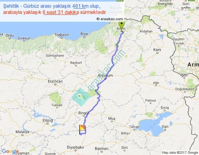 Şehitlik - Gürbüz arası yaklaşık olarak 90 km/h ile yukarıda belirtilen sürede olup, iki yerin kuş uçuşu uzaklığı (mesafesi) 334'dir. Eğer belirtilen yerler arasında uçak seferi var ise bu süre uçakla 30 dakika'ya kadar düşebilir. Yolculuk otobüsle 8 saat 28 dakika sürmektedir.