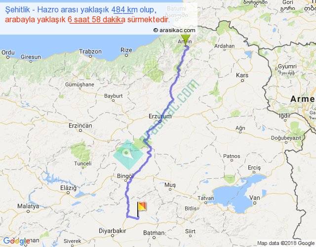 Şehitlik - Hazro arası yaklaşık olarak 90 km/h ile yukarıda belirtilen sürede olup, iki yerin kuş uçuşu uzaklığı (mesafesi) 335'dir. Eğer belirtilen yerler arasında uçak seferi var ise bu süre uçakla 30 dakika'ya kadar düşebilir. Yolculuk otobüsle 9 saat 3 dakika sürmektedir.